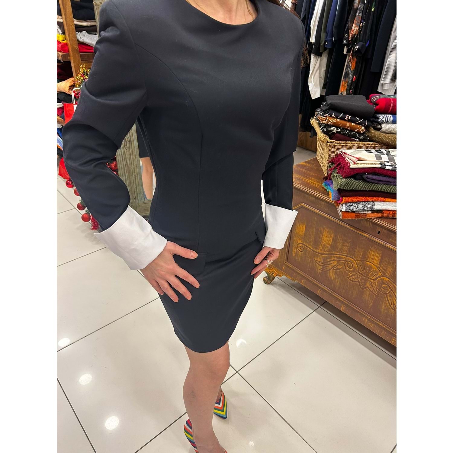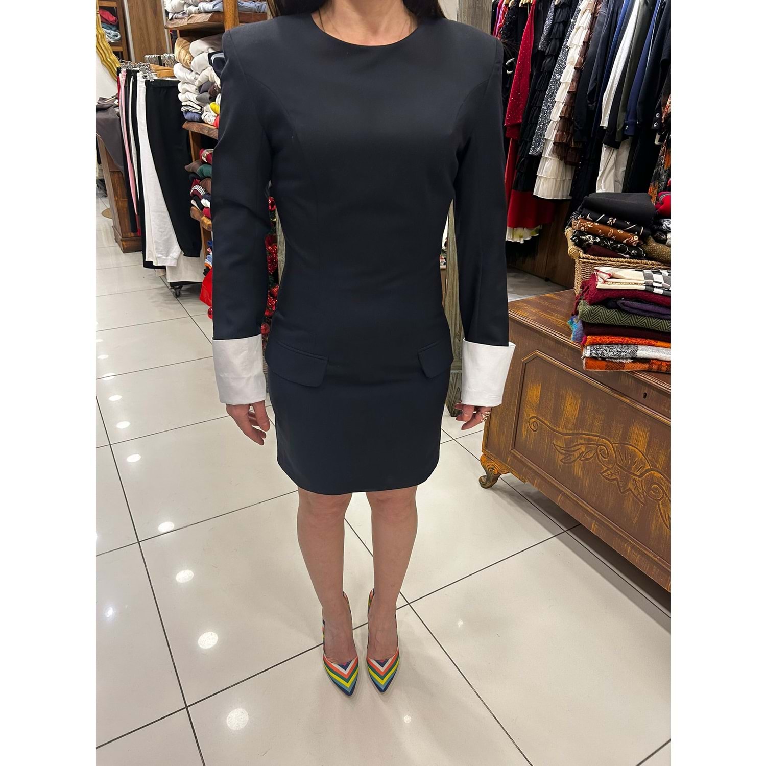 BİSİKLET YAKA ÖNDEN CEP DETAYLI MAŞET KOLLU VATKALI ARKADAN FERMUARLI ELBİSE PAMUKLU HASSAS YIKAMA